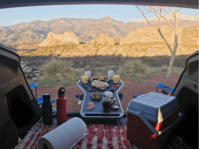 This floating table seamlessly locks onto the metal U-latch (or i-latch) in your trunk or rear cargo area, making it great for camping in your Tesla. It is both food-safe and dishwasher-safe and supports over 200 lbs of weight at the base.